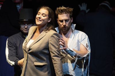 Nenašel. Zato jsem, myslím, našel důvod, proč mi to celé nesedlo, i když jednotlivých kladů spatřuju víc než dost. Je jím totální žánrová neujasněnost, spojená s jakousi obžerností: v názvu je kabaret, v anotaci mysteriózní komedie, v inscenaci potom taky ještě muzikálová parodie, absurdní hra a zamyšlení nad paralelními realitami. Jenomže: když kabaret, tak proč s pevně danými postavami a příběhovými oblouky? Když mysteriózní komedie, tak co tam dělá ten šouletový výstup, který by asi v rámci skutečného kabaretu fungoval, ale tady působí jako pěst vtlačovaná do oka po neúměrně dlouhou dobu? Když zamyšlení nad paralelními realitami, tak proč se ten úvodní sled variací na jednu jízdu z Dejvické do centra nese v nejednotném duchu s nejasnými podstatami proměnných? A když už je to takový pelmel, musí to být tak dlouhé? Otázky, samé otázky.